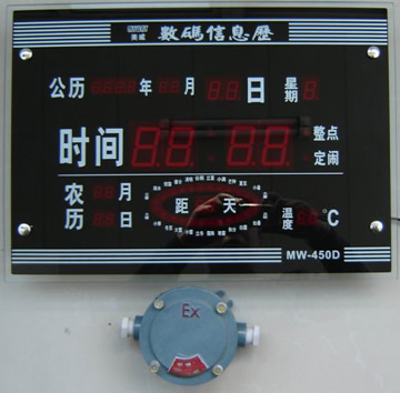該防爆數(shù)字鐘(數(shù)碼信息萬年歷)采用先進(jìn)的集成電路制成的防爆本質(zhì)安全型數(shù)字萬年歷,供電經(jīng)BKZ-1型防爆轉(zhuǎn)接器接入220V交流電源。該防爆數(shù)字鐘為壁掛式,適用于含有易燃易爆氣體混合物的場(chǎng)所,如石油、化工、油庫、鋼鐵、焦化、礦山等企業(yè)。